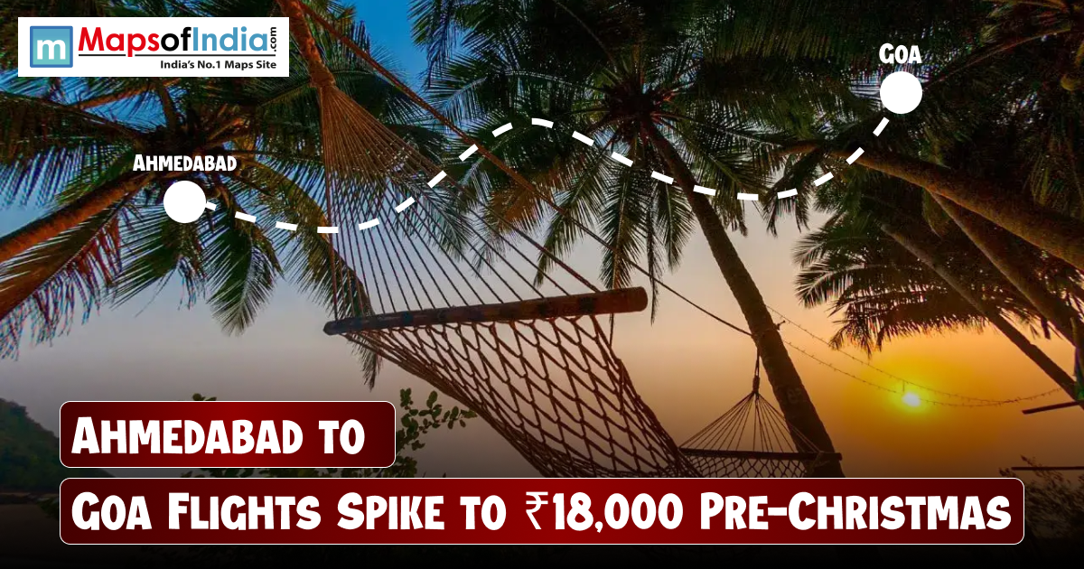 A scenic beach view with palm trees and a hammock at sunset, overlaid with a dotted flight path from Ahmedabad to Goa, along with a headline reading “Ahmedabad to Goa Flights Spike to ₹18,000 Pre-Christmas,” and the Maps of India logo in the top left corner.