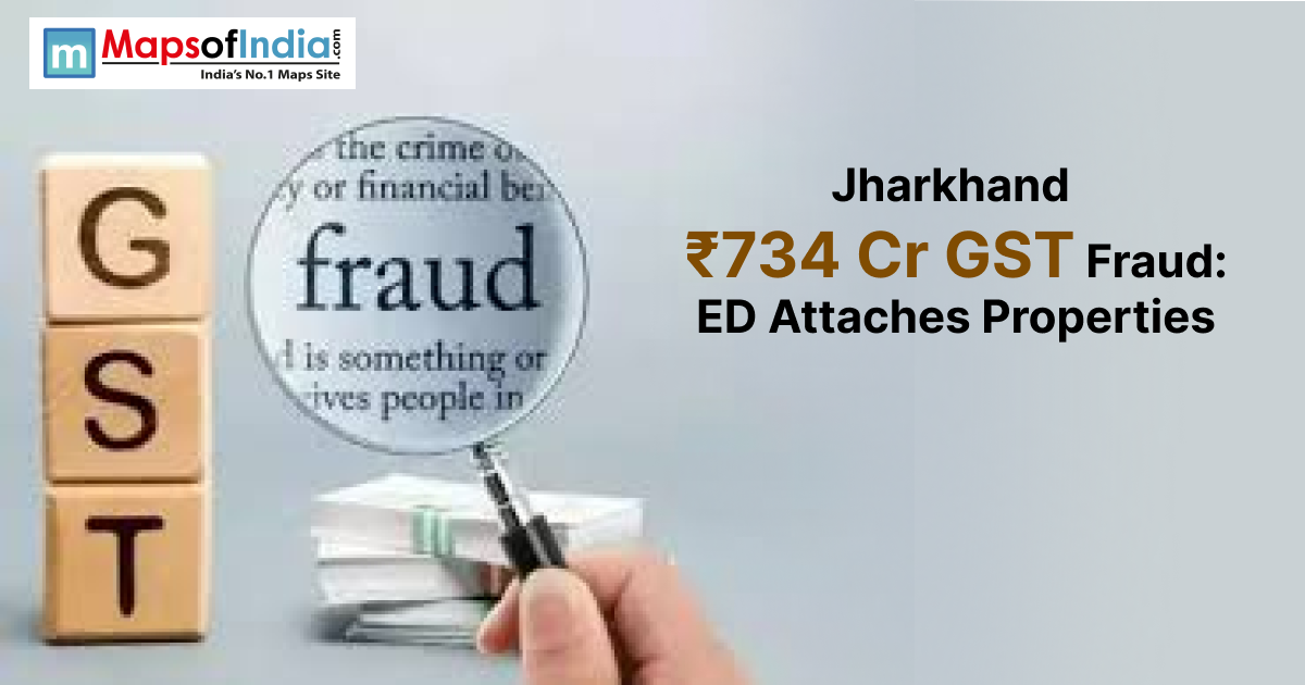News update showing Jharkhand ₹734 crore GST fraud case with Enforcement Directorate attaching properties, represented with GST blocks, magnifying glass highlighting fraud, and currency bundles.