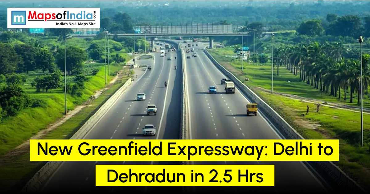 A wide multi-lane greenfield expressway with light traffic, lush greenery on both sides, and an overbridge in the distance, highlighting a new route reducing travel time from Delhi to Dehradun to 2.5 hours, branded by MapsofIndia.com.