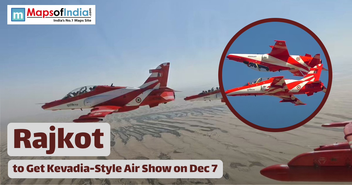 Indian Air Force jets performing an air show in the sky, with text stating “Rajkot to Get Kevadia-Style Air Show on Dec 7,” along with the Maps of India logo.