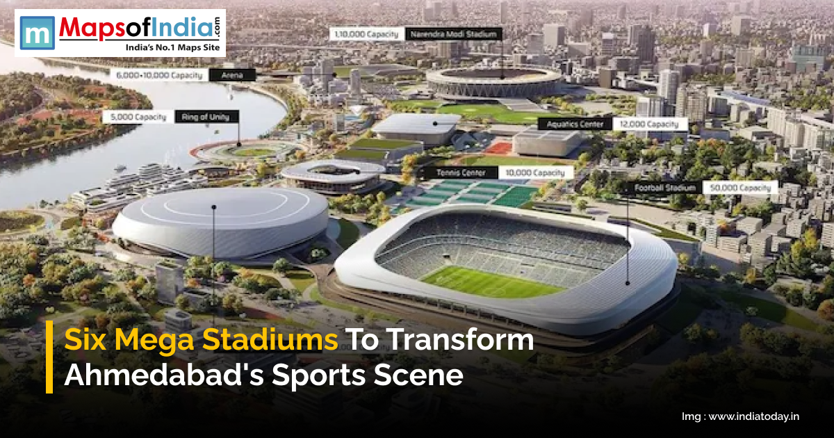 An aerial illustration of Ahmedabad’s upcoming sports infrastructure featuring six mega stadiums, including cricket, football, tennis, aquatics, and multipurpose arenas, highlighting their capacities and layout across the city.